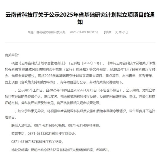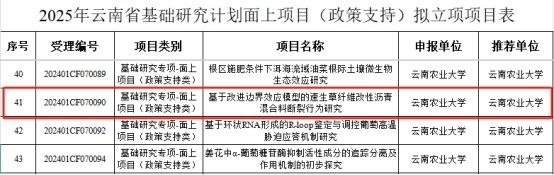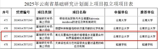 近日,云南省科技厅发布了“2025年度云南省基础研究计划项目拟立项名单”,我们张玉波、桂婉妹两位教师分别获得云南省基础研究计划面上项目及面上政策类支持项目。
