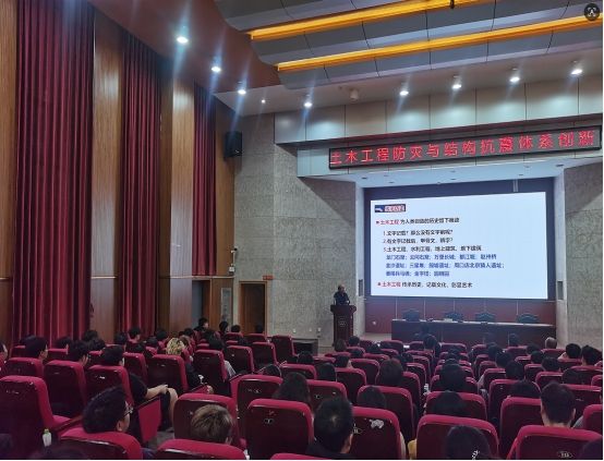 讲座中,曹万林教授围绕土木工程的历史传承、现实承载与未来支撑展开,系统阐述了土木工程在传承文化、保障人类生存发展及推动未来建设中的核心作用。重点围绕 “土木工程防灾与结构抗震体系创新” 这一前沿主题展开深入讲解,重点介绍了其团队研发的多腔钢管混凝土巨型柱、新型“鼓形”“X 形”节点等技术。在传统建筑结构抗震面临诸多挑战的情况下,这些技术展现出独特优势,成功应用于多个大型工程,在超高层建筑巨型柱框架结构、装配式低多层住宅轻钢组合结构等领域,具有抗震性能优、适配性强、绿色节能等显著特点,为土木工程防灾与结构抗震提供了创新性的解决方案,引发了在场师生的深入思考。