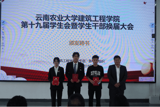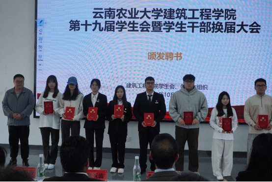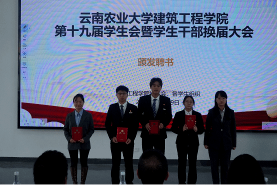 在庄严的国歌声中,本次换届大会正式拉开帷幕。学院团委书记朱诗芳老师宣读了bv伟德国际体育第十九届学生会、第二届院长助理、第二届艺术团、第三届就业与创新创业协会及各运动队的学生干部任职名单。在场领导和老师为新一届学生干部颁发了聘书。一份份聘书,既是荣誉的象征,更是责任的嘱托,在闪光灯的定格中,新老接力的使命感在会场中久久回荡。