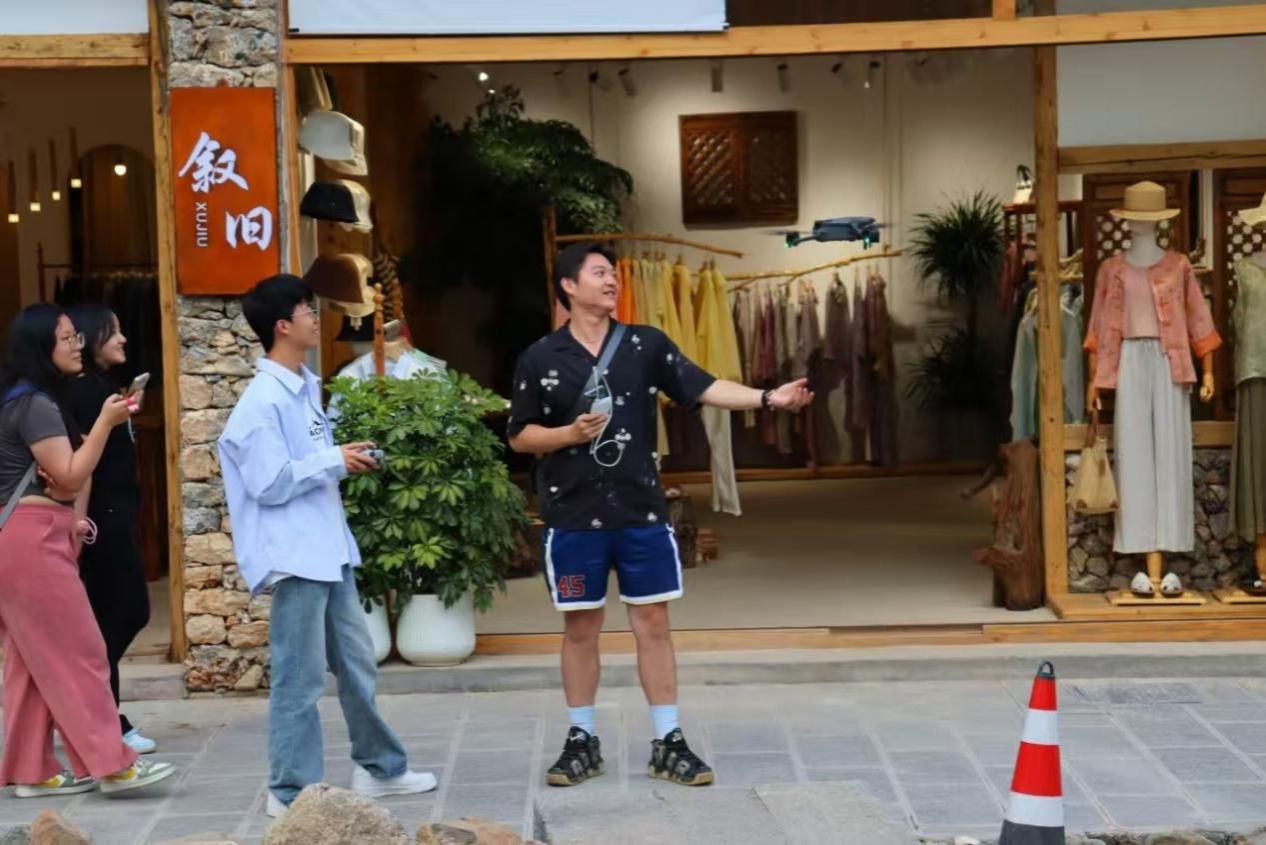 实践队首站来到丽江古城保护管理局。杨主任的一番话如醍醐灌顶:“古城不是‘盆景’,而是活态社区。”这里生活着23个民族、3.2万原住民,他们共用一张“印玺”形的棋盘式街巷布局。沿着四方街的辐射状巷道漫步,藏族披肩、白族扎染、彝族刺绣在同一条石板路上“摆摊”,不同语言的吆喝声此起彼伏。游客们低头挑选手串,不经意间就可能成为“共享舞台”的主角——多元文化在这里并非静态的展陈,而是融入日常生活的鲜活场景,奏响了一曲和谐共生的交融乐章。