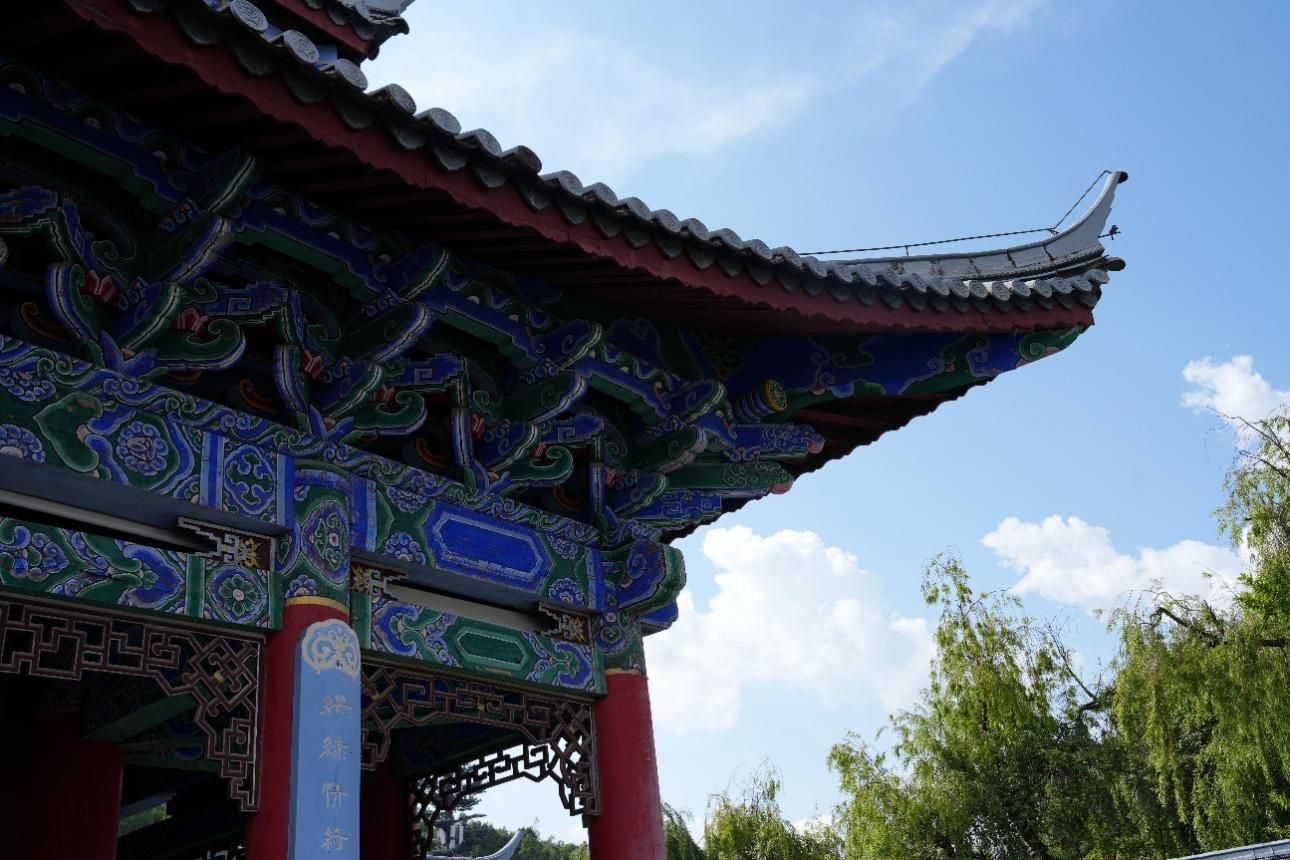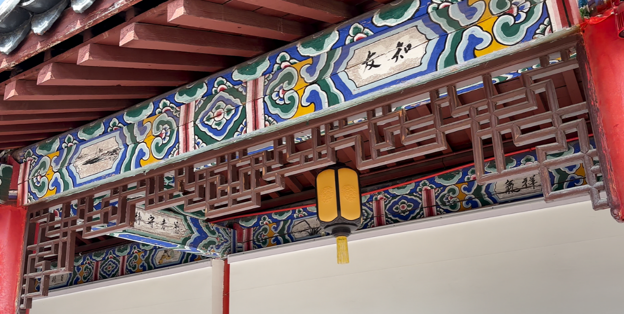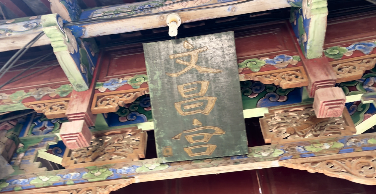 接着,实践团队来到丽江古城,重点参观了坐落于狮子山巅的文昌宫。作为纳西族尊崇文运的重要场所,文昌宫的彩画题材紧扣“崇文重教”的主题,每一笔都蕴含着深刻的寓意。在色彩运用上,巧妙融合了传统与地域特色:以赭石打底,营造出古朴厚重的氛围;用朱砂勾边,增添了画面的鲜明感;再以金粉饰细节,使整个彩画显得华丽而庄重。大殿藻井的彩绘更是独具匠心,青蓝底色上缀满金点,螺旋彩绘如星光环绕,与文昌主掌星象的寓意相呼应,仿佛将浩瀚星空浓缩于这一方天地之间。队员们站在藻井下,仰望着这精美的彩绘,不禁为古代工匠的智慧和创造力所折服。