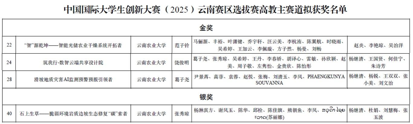 省级奖项方面,同样成果丰硕。《滑坡地质灾害AI监测预警预报引领者》项目(负责人:23级城建研究生葛子尧)获省级金奖,《石上生草——脆弱环境岩质边坡生态修复‘碳’索者”》项目(负责人:24级城建研究生张秀琼)获省级银奖。